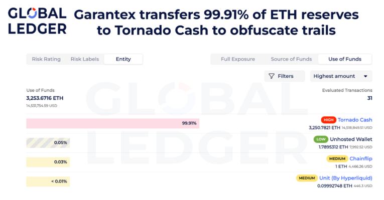 Global Ledgerの説明によると、Garantexは、資金の流れを隠すために特別に設計された支払いシステムを使用している。取引所はその準備金をトルネード・キャッシュのようなミキシングサービスに移し、ミキシングサービスでは資金を混ぜて出所をわからなくする。